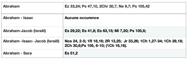 Cet argument demeure souvent difficile, car l'absence d'une évocation ne signifie pas nécessairement la non-existence d'une tradition. Par exemple, vous ne possédez dans la Bible aucune allusion à Adam et Eve. Est-ce que cela veut dire que ce récit ne fut seulement écrit à l'époque helléniste ? Probablement pas. Mais on trouve quand même dans cet argument quelques observations que l'on peut effectuer et qui apparaissent intéressantes. Par exemple, quand on regarde la figure d'Abraham comment il apparaît cité en dehors de l'Hexateuque (Gn - Jos), on va en effet se rendre rapidement compte que contrairement à Jacob qui figure citée tout le temps ; Abraham se trouve très peu cité. D'ailleurs ce qui est intéressant si vous prenez le tableau ci-dessous il n'y a aucune occurrence du duo Abraham et Isaac.