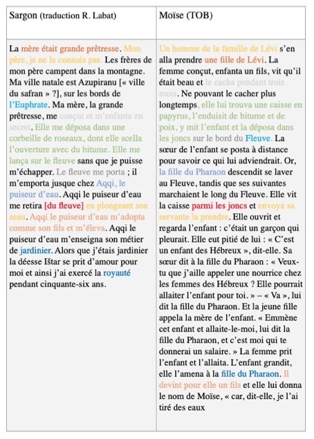 Autre possibilité, c'est lorsque vous possédez un récit en dehors de la Bible qui figure très proche d'un récit biblique. C'est le cas par exemple, de l'histoire de la naissance de Sargon d'Akkad (en Mésopotamie). Le récit rappelle étrangement le récit biblique de la naissance de Moïse (Ex 2, 1-10). Cette ressemblance générale nous apparaît précieuse, car c'est dans les minces différences entre les deux textes que nous repèrerons des clefs de lecture afin d'interpréter ce que Israël a bien pu vouloir dire à la postérité.